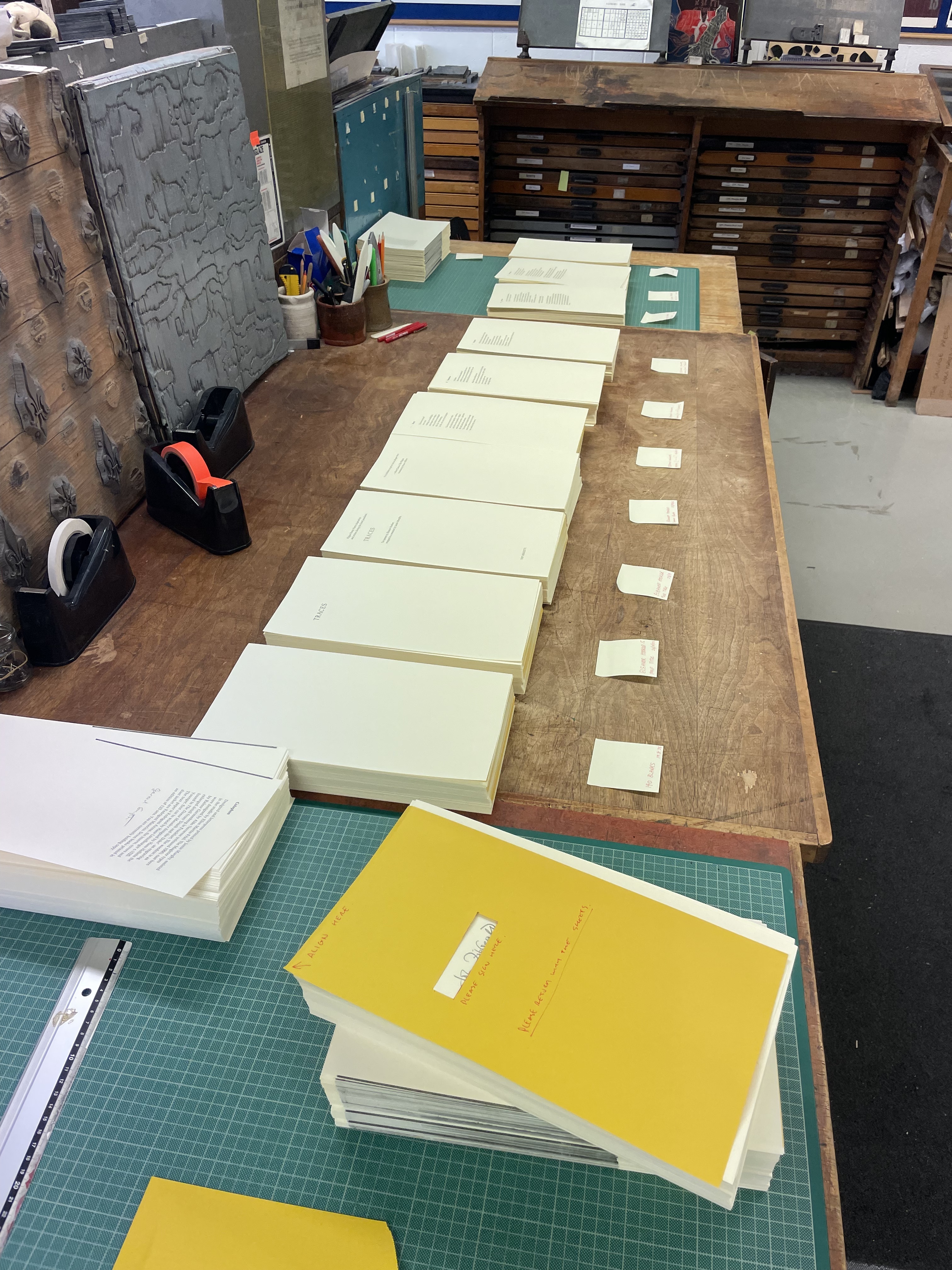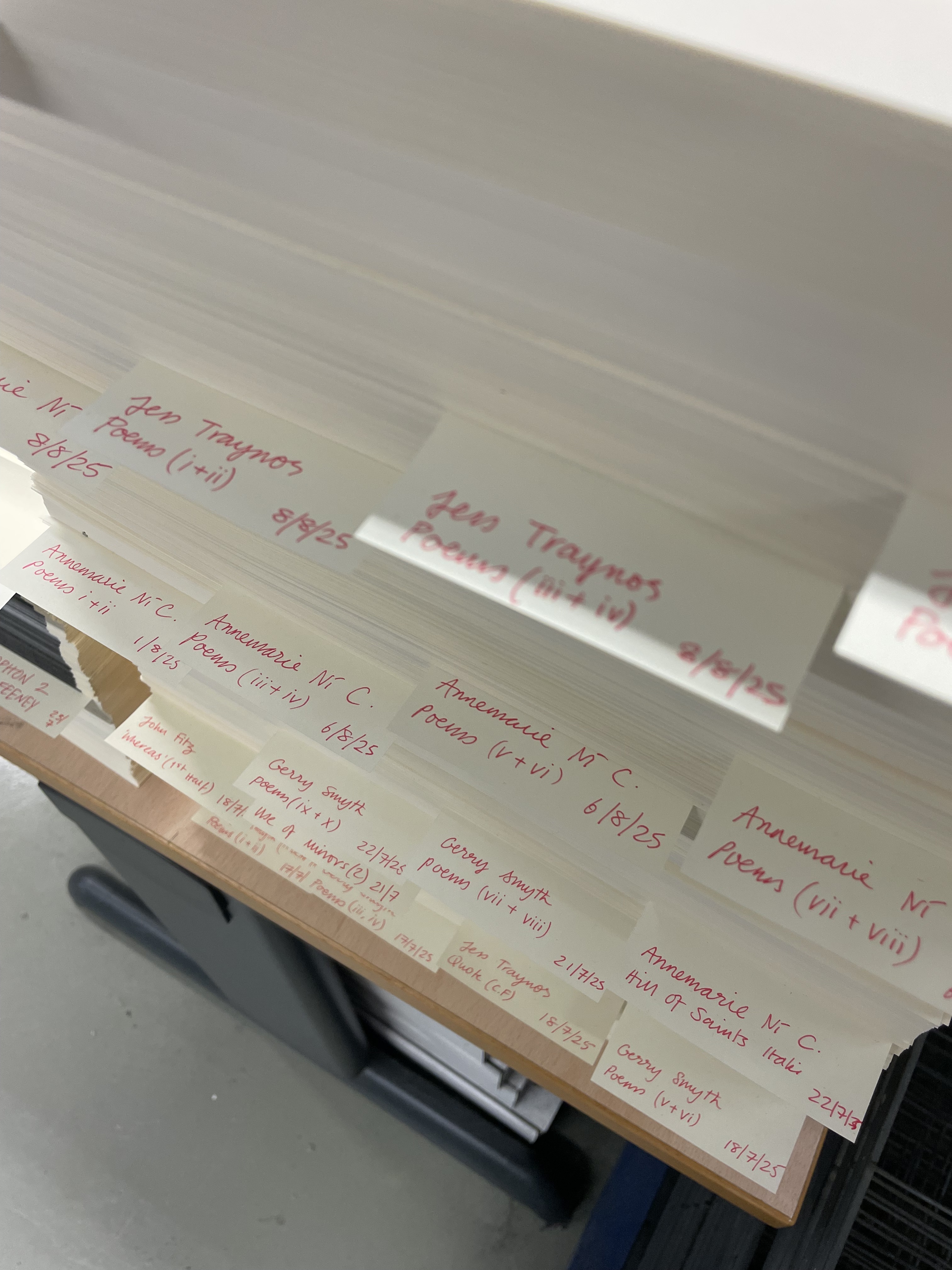 I spoke with Jessica Traynor about the idea, as I often do, and she suggested some potential names, and quickly the project grew to become ten poets and a book-maker. Incredible texts began to appear, followed by revisions and new thoughts and expressions. At this point I had intended to make a single book containing all the work. When designing the book it became very clear that it had grown into quite an undertaking and deserved to be given more consideration than I had so far allowed myself to give it, which meant it had to be put further down the queue a little until I could afford the time and, necessarily, the resources to see it through.