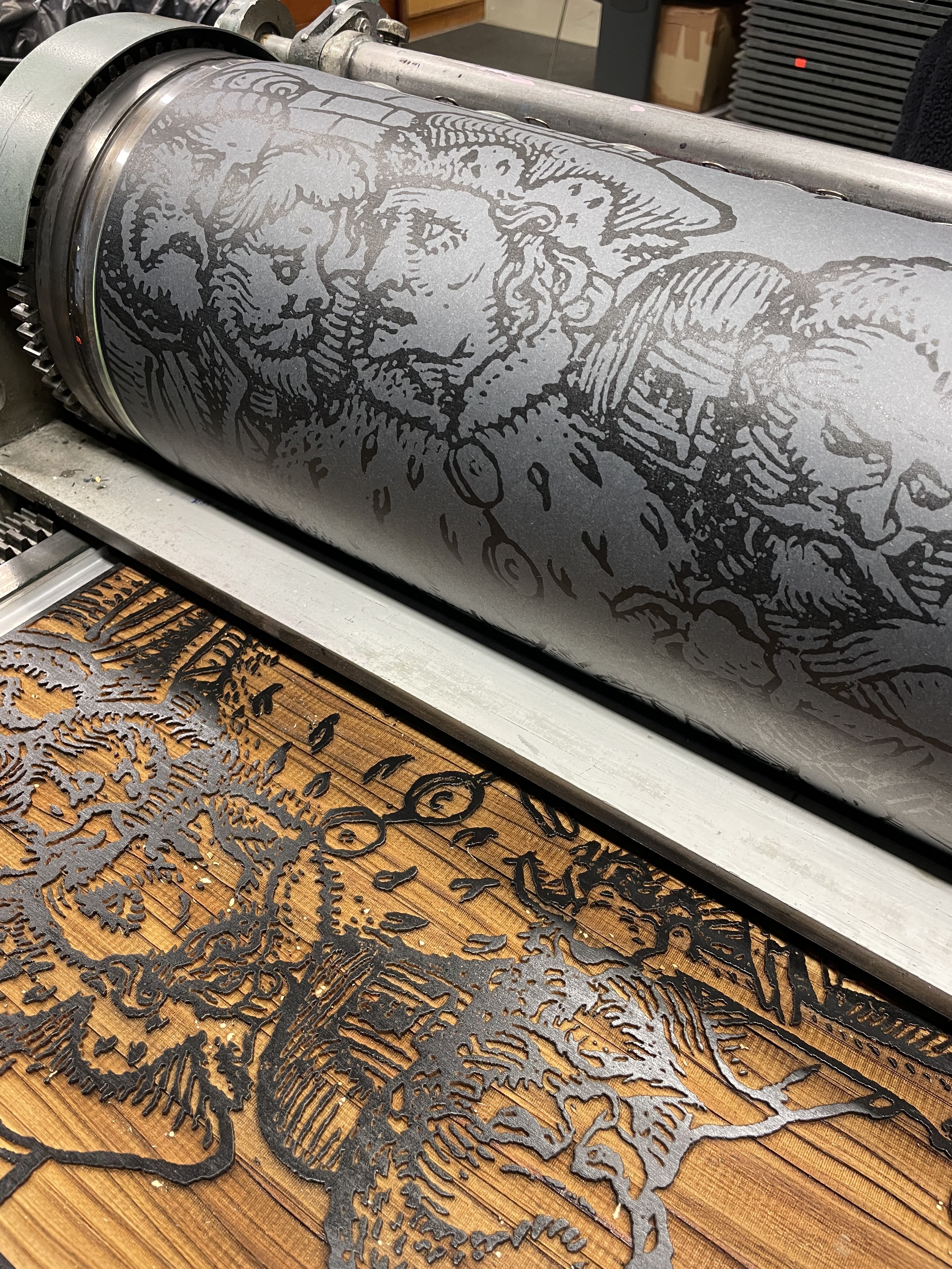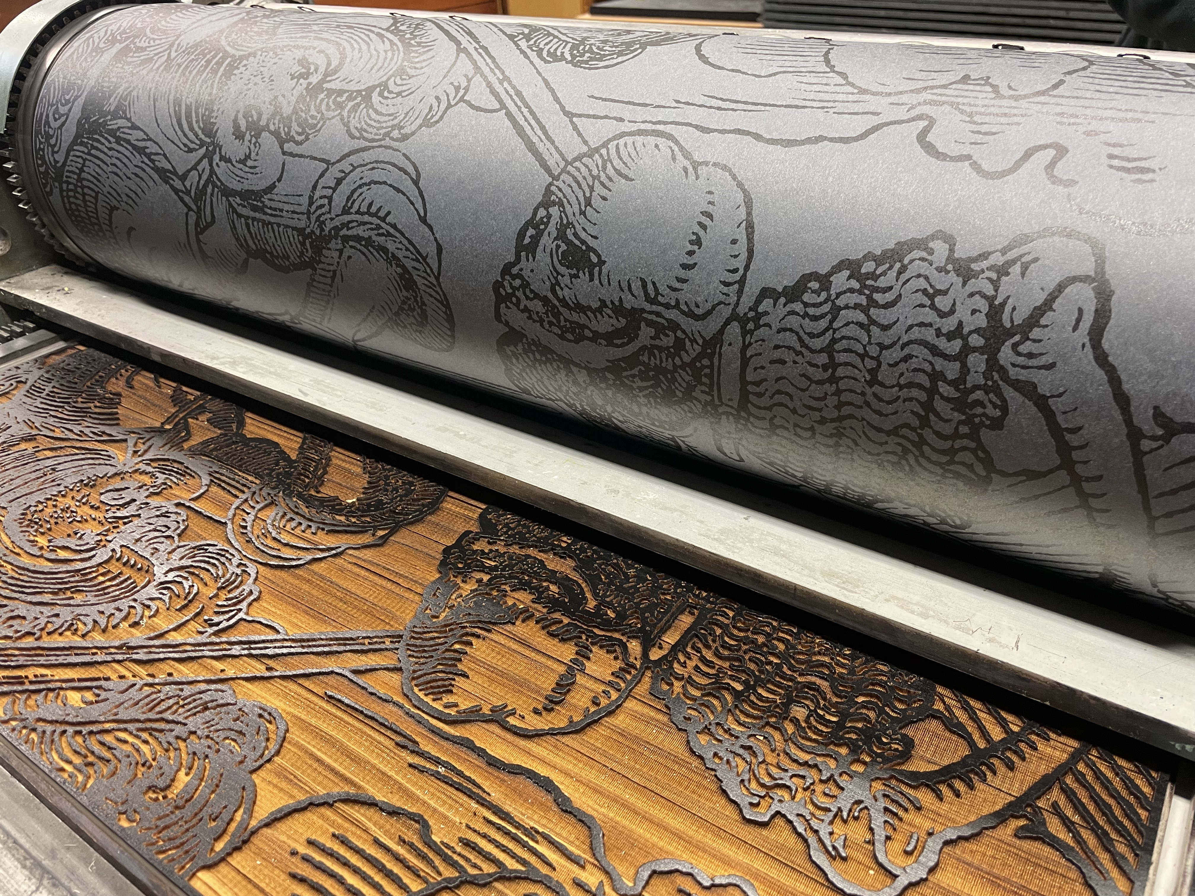I had also changed the direction of the visual accompaniment away from domestic photographic images. It was now my intention to work with the woodcuts found in Hans Holbein the Younger's The Danse Macabre (1523-1525). These woodcuts represent the very idea of death and how, without prejudice, it may visit us at any time. Due to their beauty, their emotive relevance, their quincentennial engraving date and their universal theme, I began to study these images and to plan how they might become the major illustrative element of the project. Details from seven Holbein woodcuts were chosen to wrap the poetry by becoming seven dust jackets. My initial plan was to focus on details from the images (original size roughly 6.5 x 4.9 cm), enlarge those by 20000% (to 720cm across) and to cut them by hand. After some time and some testing, I decided to laser engrave the images into pine boards. Are they still woodcuts? Are they now my engravings? I decided to call them my woodcuts.