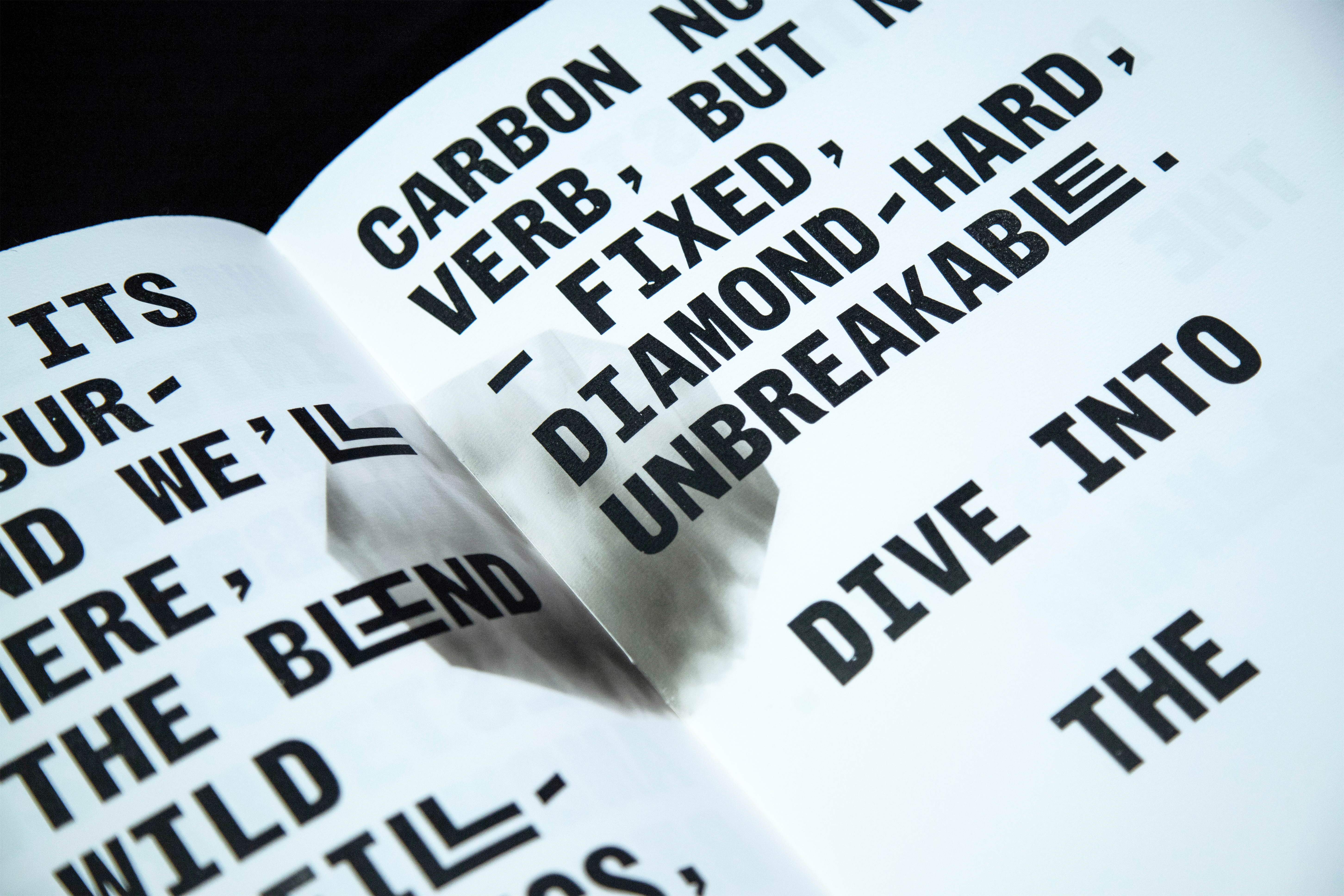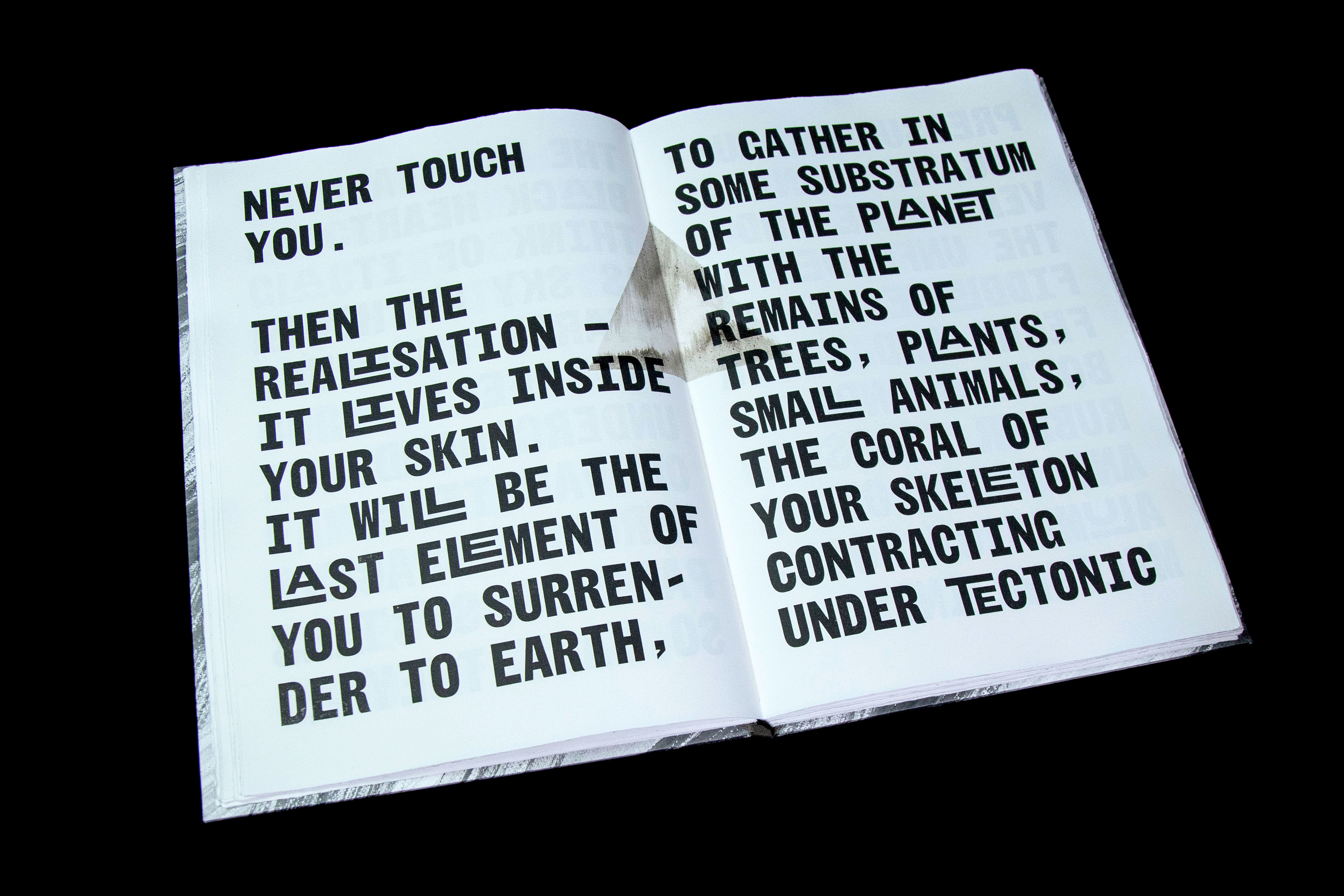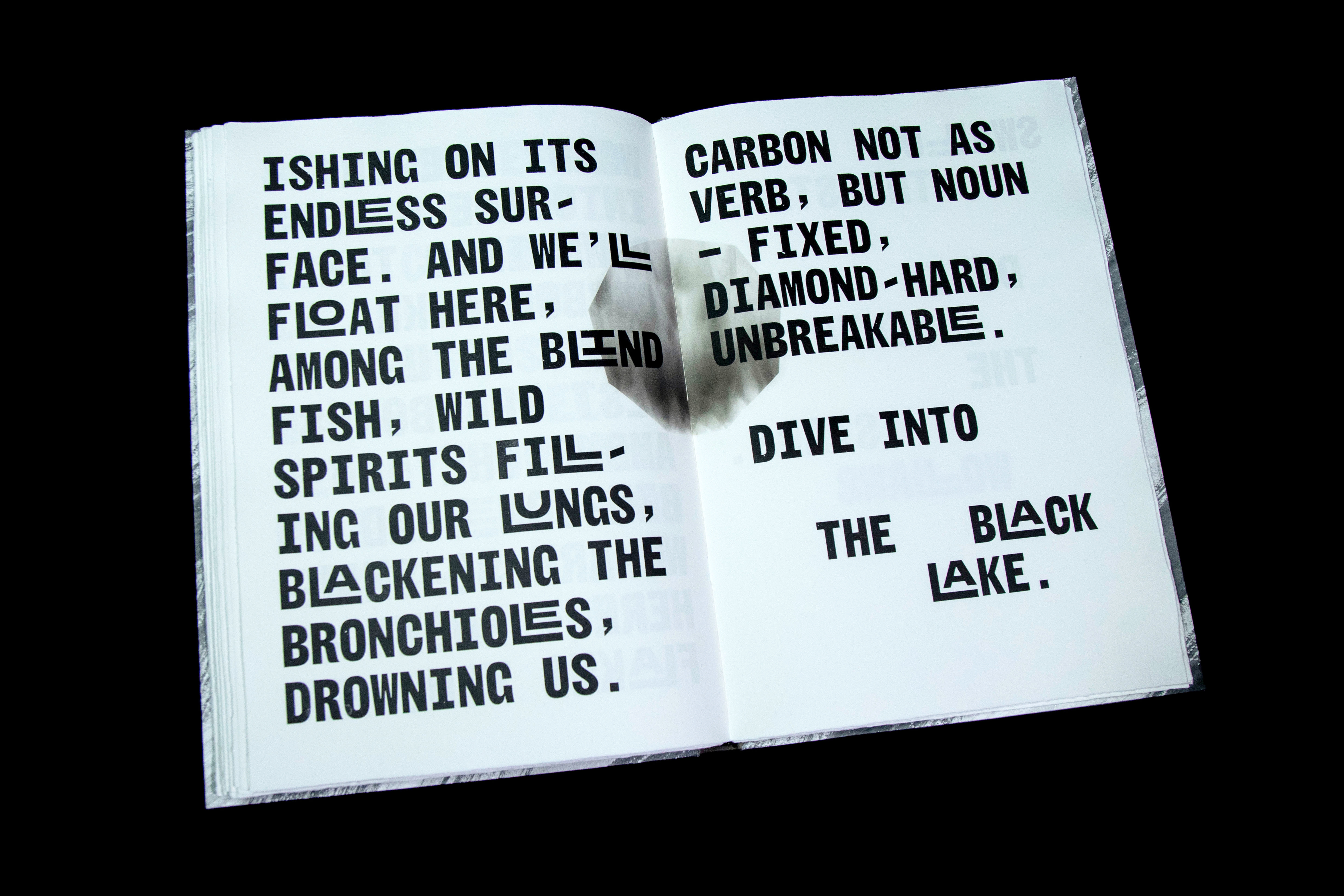 Inspired by the aesthetics of hand-typed scientific reports and woodtype printed protest posters, Jamie Murphy has interpreted the text by employing a new mono-spaced typeface developed specifically for this project in collaboration with type designer Bobby Tannam. In an effort to capture the materiality of the subject, evidence of carbon rich matter emerges throughout the book in the form of smoke, lampblack, soot, charcoal, peat, graphite and diamond.